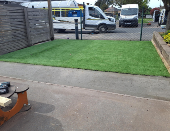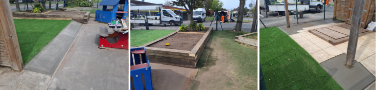 Key works included the installation of new artificial grass areas, improved drainage and sub-base construction, a new concrete access ramp to improve accessibility, landscaping enhancements using reused sleepers, planting improvements, and upgrades around the play pit area. The entire space was fully tidied on completion and left ready for immediate use.